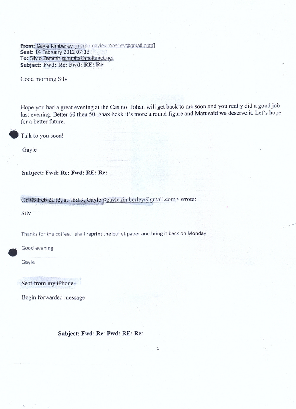 On 15 March, Delfosse tells Zammit she is “confused at the proposal”; when Zammit informs Kimberley, she reacts with some urgency: “Mela you left the title of email ‘copy/paste proposal’???”. She name-drops Iosif Galea – he was supposed to have confirmed the correct proposal to Estoc. And she scripts an answer for Zammit to send back to Delfosse.