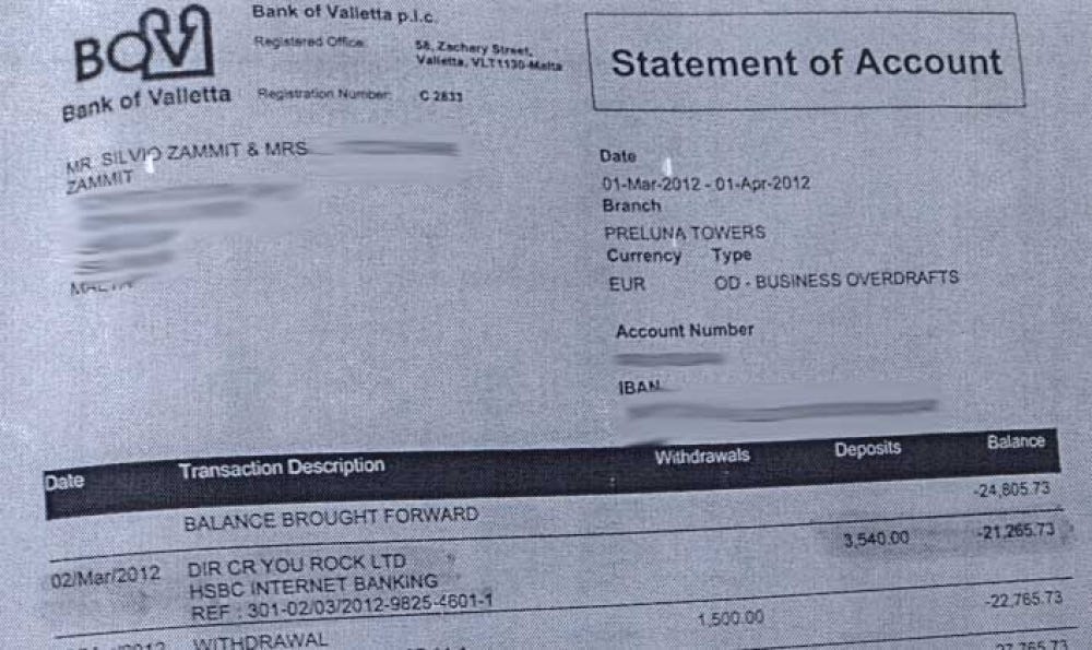 On 2 March 2012, Matthew Kimberley advances Zammit a €3,540 bank transfer via his company You Rock Ltd.